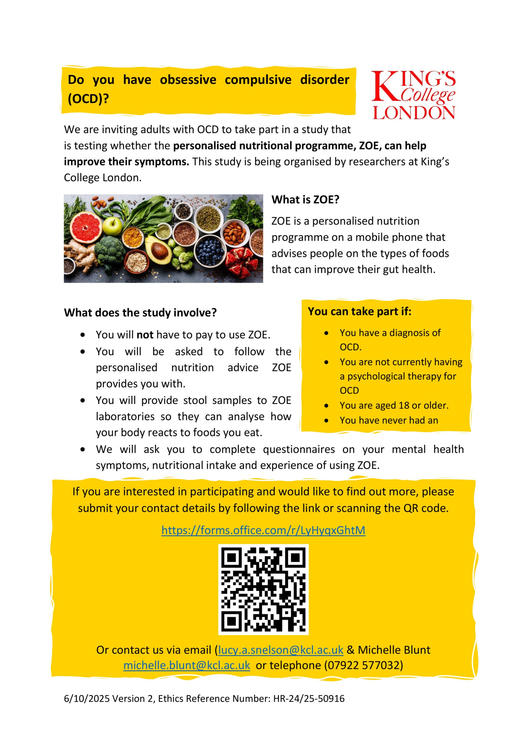 We are inviting adults with OCD to take part in a study that is testing whether the personalised nutritional programme, ZOE, can help improve their symptoms. This study is being organised by researchers at King’s College London.