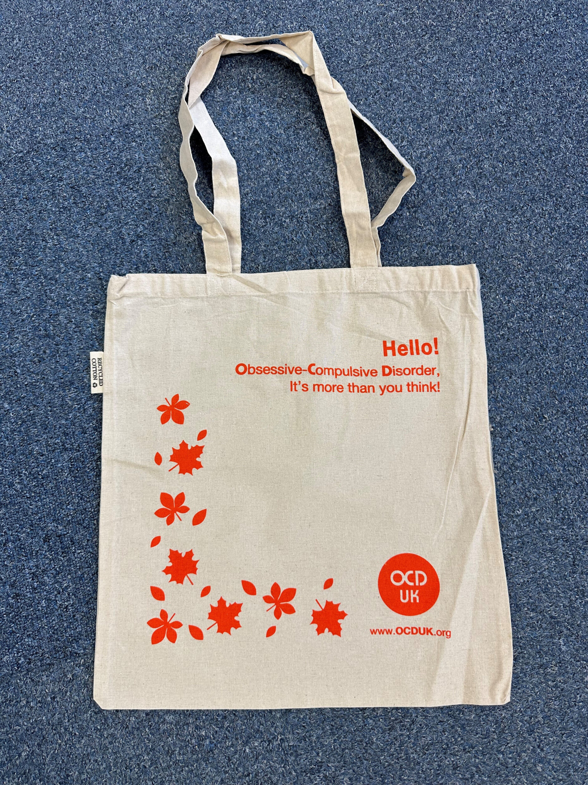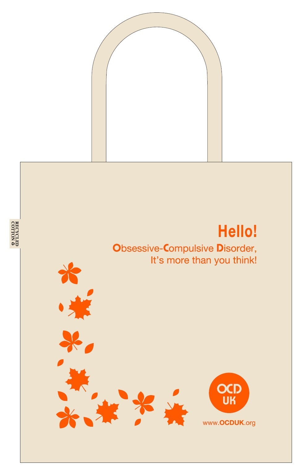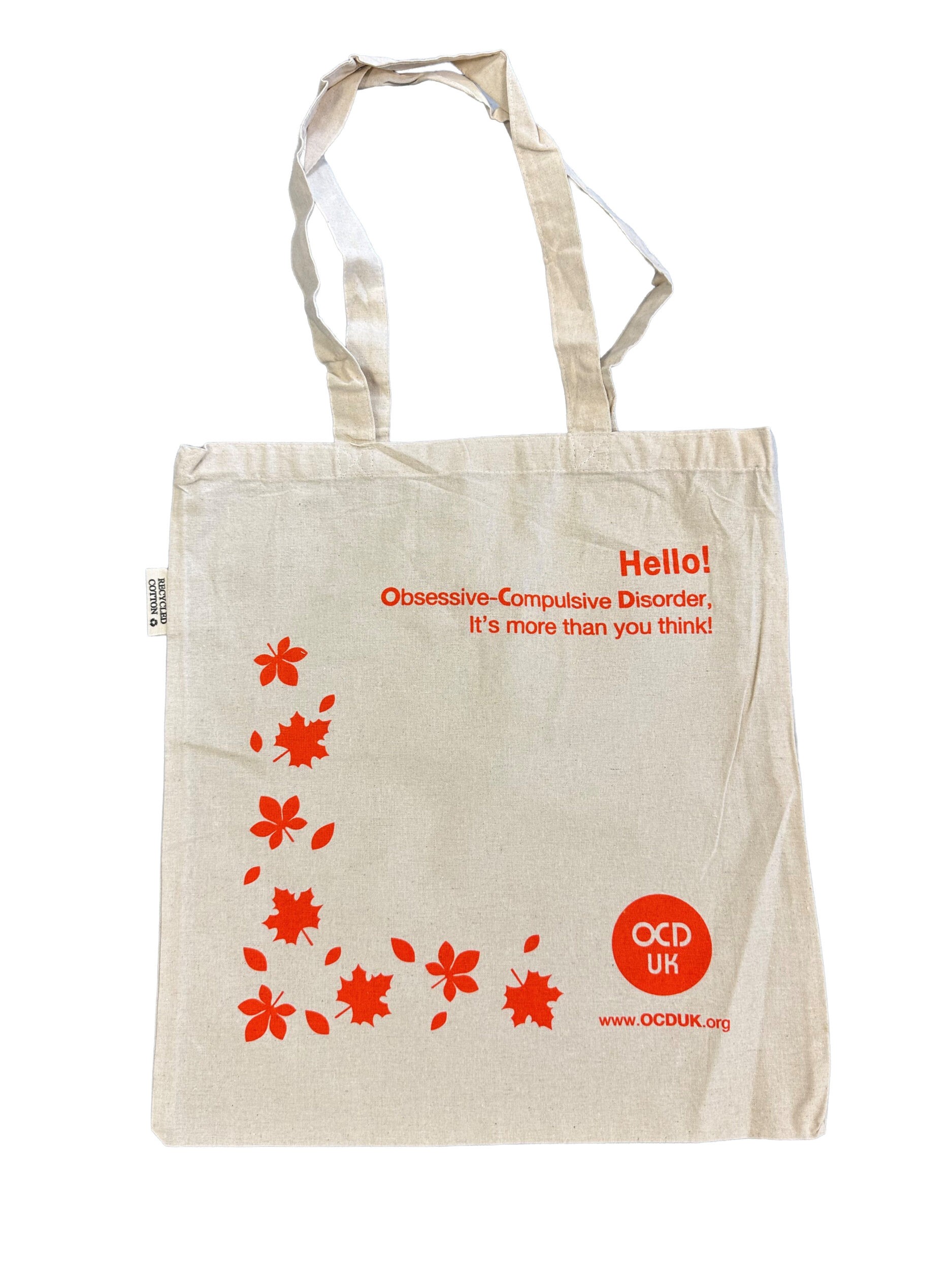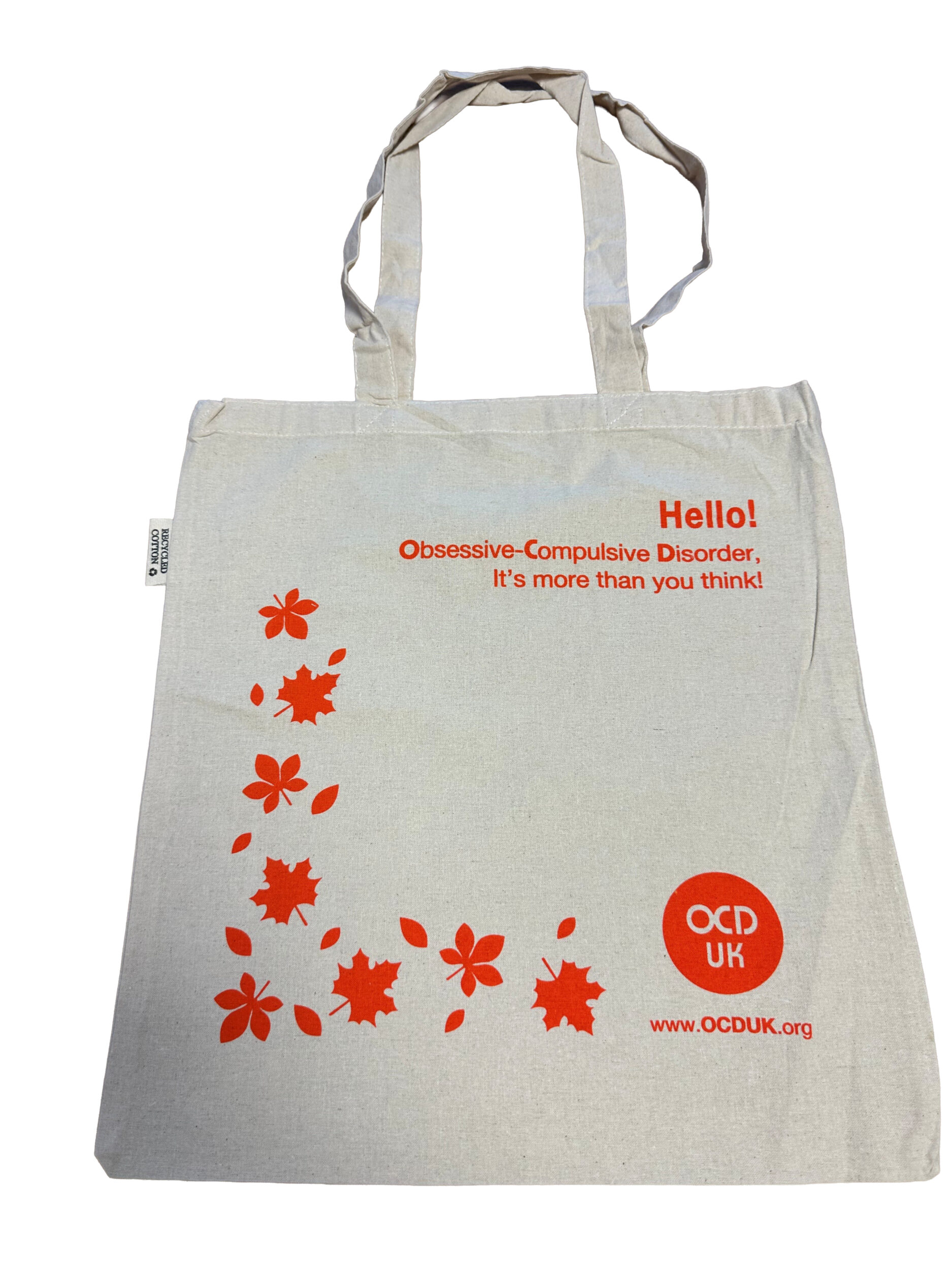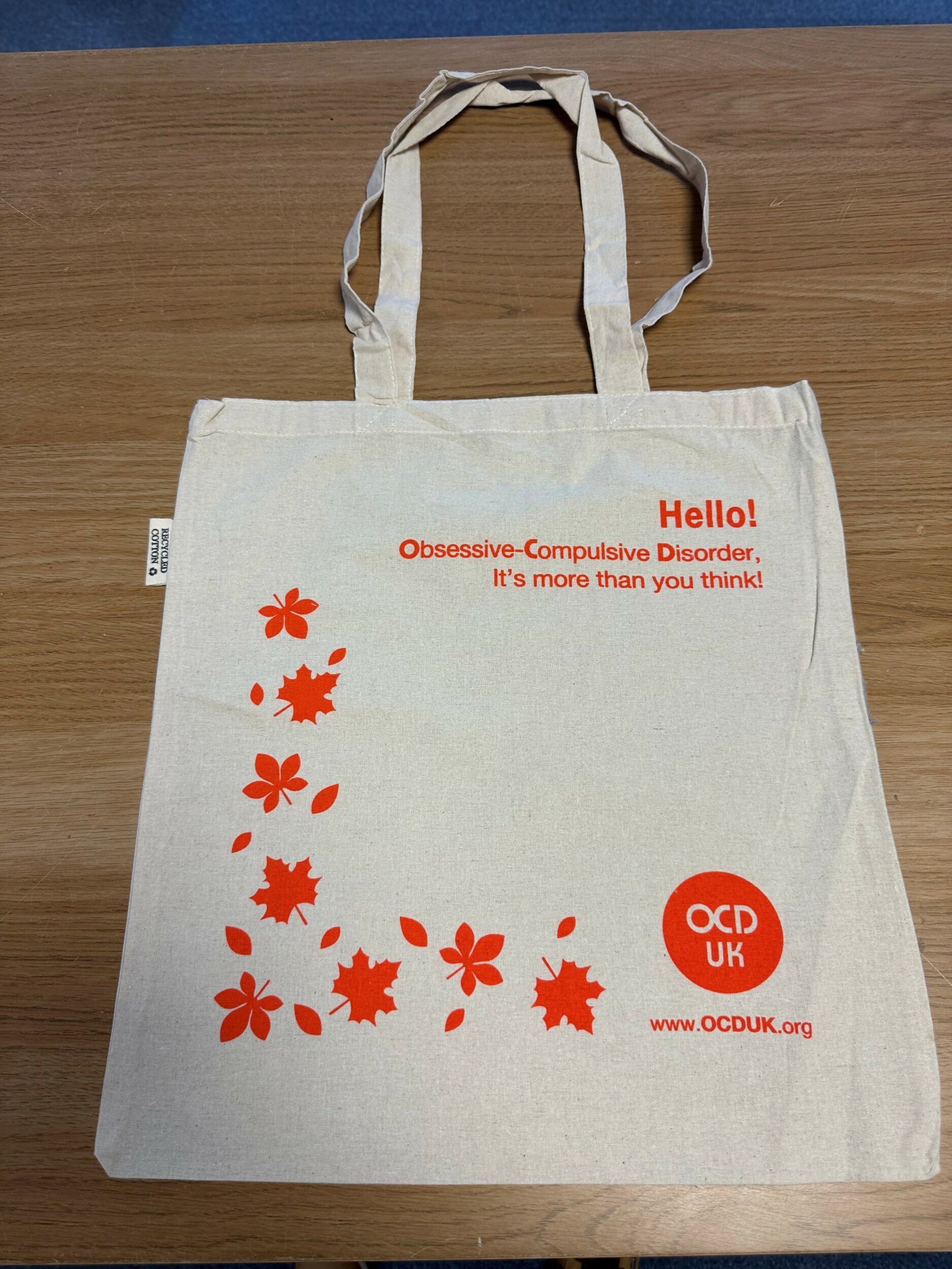 • Each bag carries the OCD Awareness message on one side ‘Hello, Obsessive-Compulsive Disorder, It’s more than you think!’ along with autumn leaves and the charity logo and website address in the bottom corner.