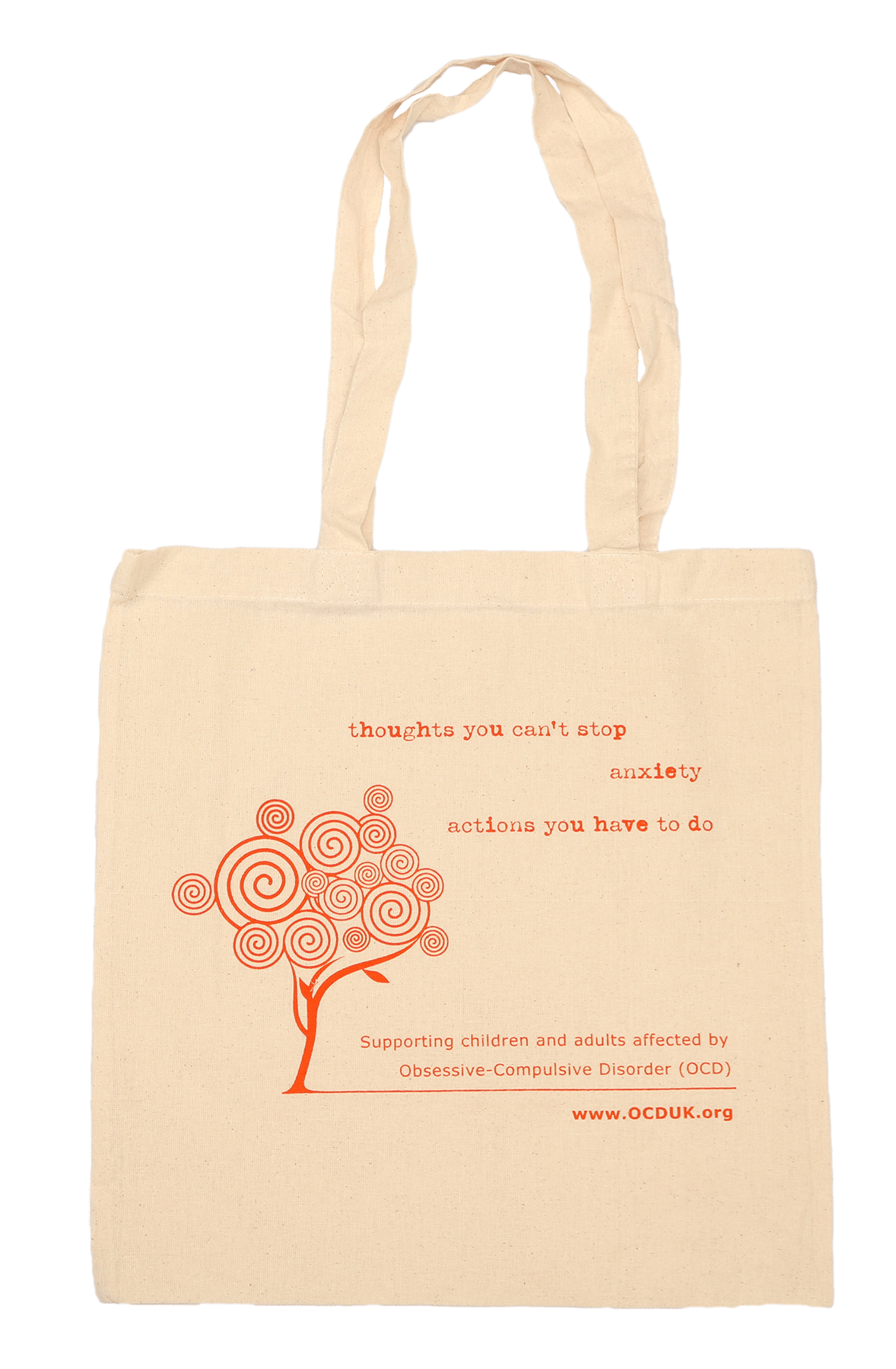 The bags carry the message of either ‘just because you can’t see a problem, doesn’t mean it’s not there!’ or ‘thoughts you can’t stop, anxiety, actions you have to do’ and a reference to Obsessive-Compulsive Disorder and the charity’s website address.